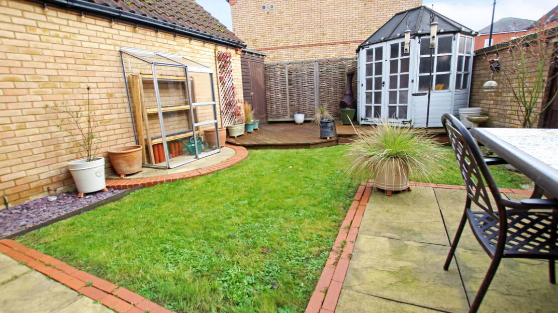 Fully enclosed rear garden, mainly laid to lawn with paved patio, raised timber decking area with hidden shed to rear of garage and timber summerhouse, both with power and light connected, gated access from driveway.