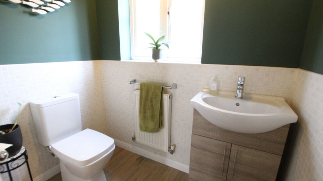 uPVC obscure double glazed window to rear elevation, single panel radiator, re-fitted modern two piece suite comprising low level W.C and wash hand basin set into cupboard unit with mixer tap over, tiled to dado height to all elevations, continued feature ceramic tiled wood effect flooring.
