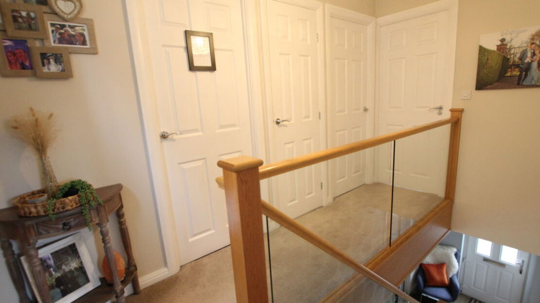 uPVC double glazed window to rear elevation, single panel radiator, continued feature glass balustrade, access to loft space, built in airing cupboard housing upgraded Worcester gas combi boiler, communicating doors to: