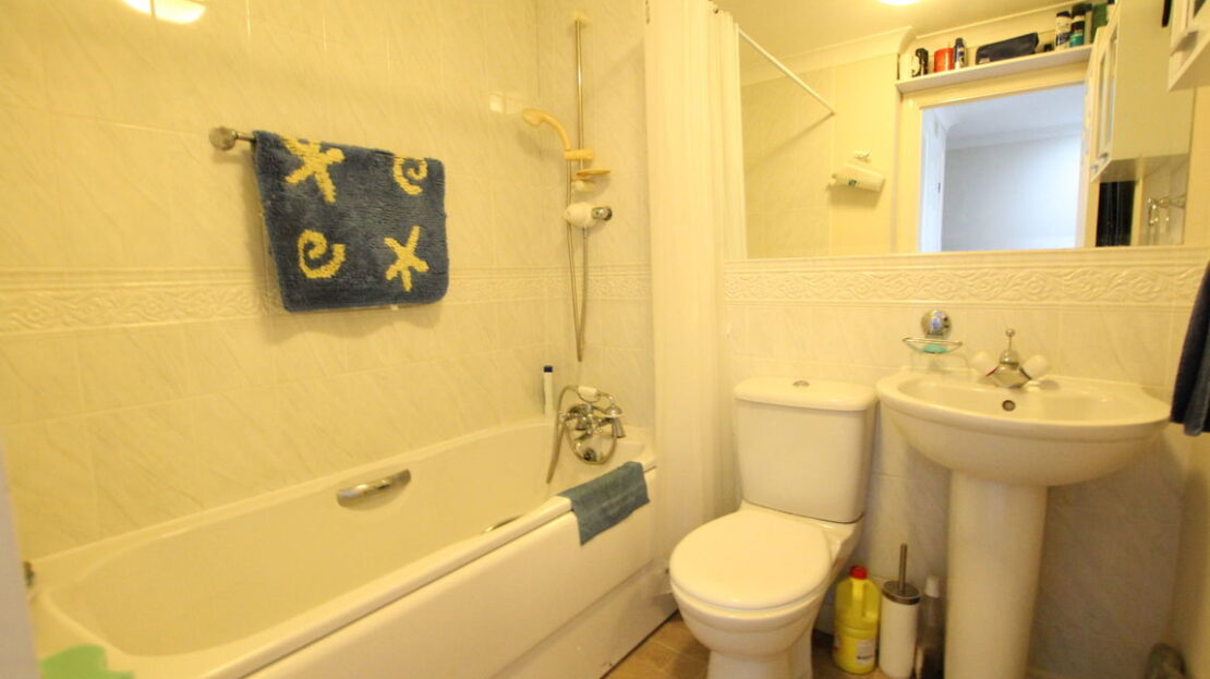 Single panel radiator, three piece suite comprising of low level W.C, wash hand basin, panel bath with shower/mixer tap over, tiling to splash areas.