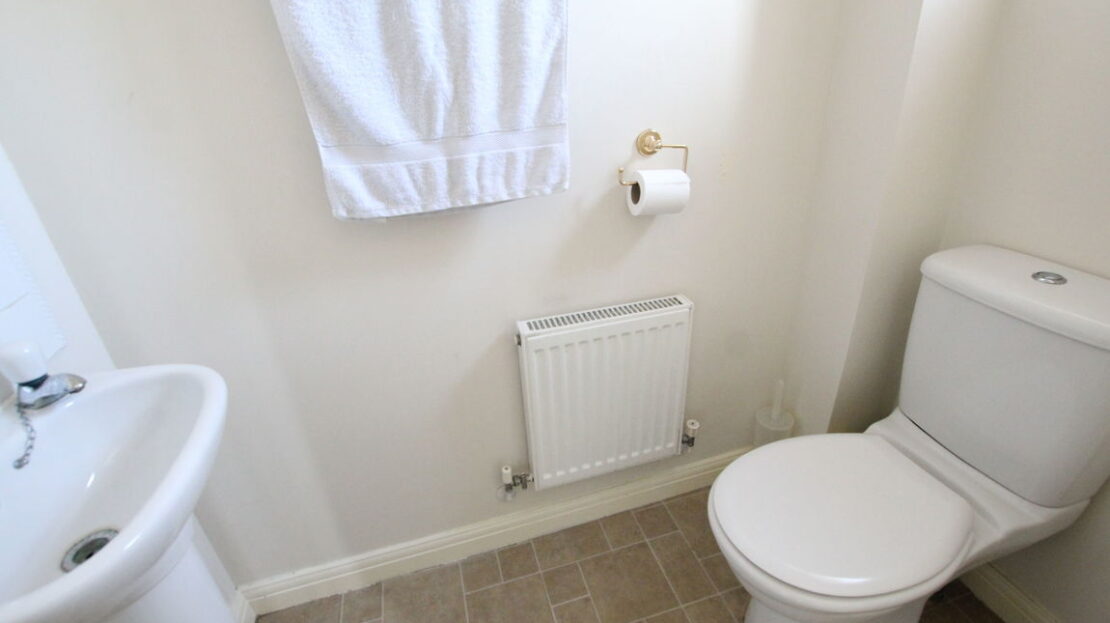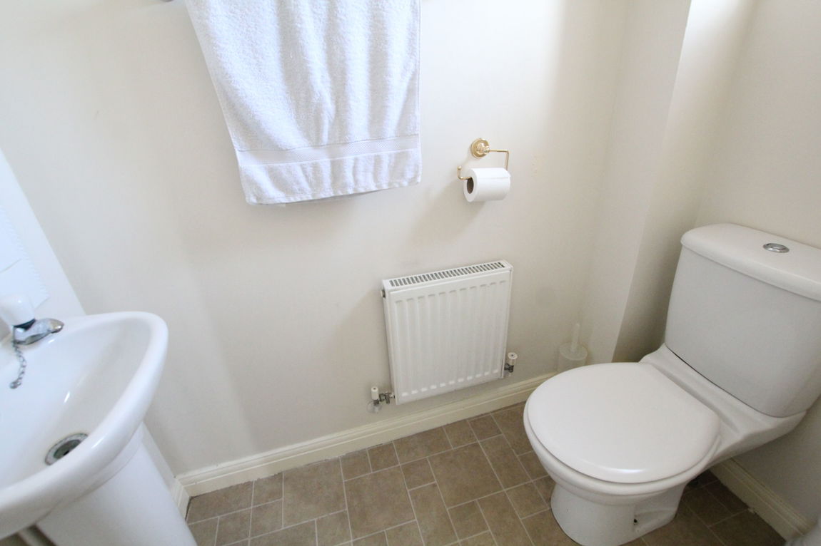 uPVC obscure double glazed window to front elevation, single panel radiator, two piece modern white suite comprising of low level W.C, wash hand basin, tiling to splash areas.