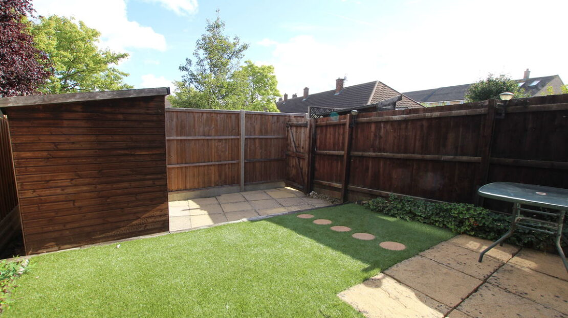 Mainly artificial lawn, paved patio, timber garden store/shed, enclosed by timber panel fencing.