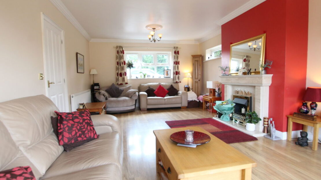 A triple aspect room with uPVC double glazed windows to front and side elevation, Twin uPVC double glazed patio doors to rear elevation plus a further set opening into the attached Garden Room, two double and one single panel radiators, cornicing to ceiling with two light roses, marble fire surround with inset electric fire.