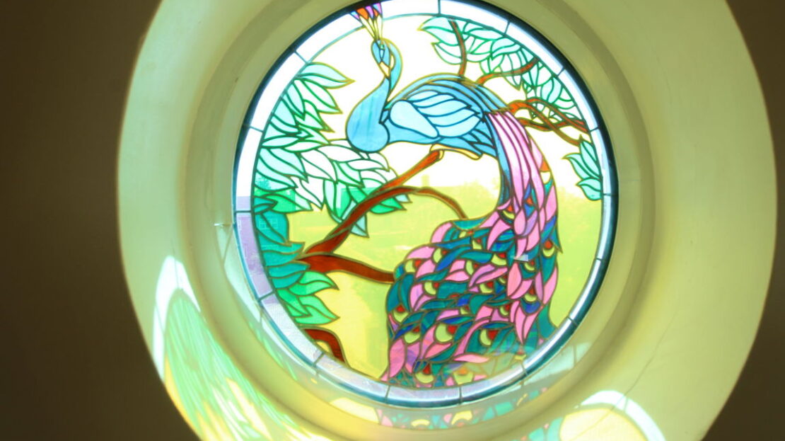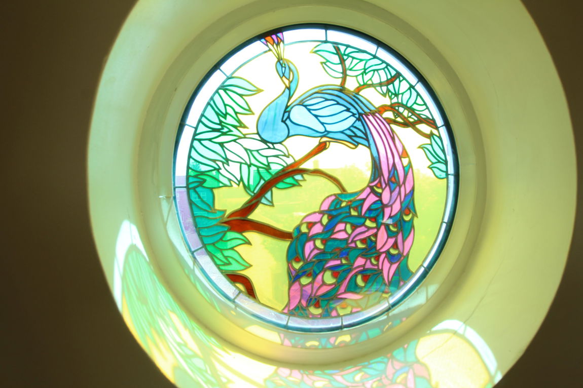 Tiled base, inner uPVC double glazed leaded and stained glass entrance door and matching side window to: