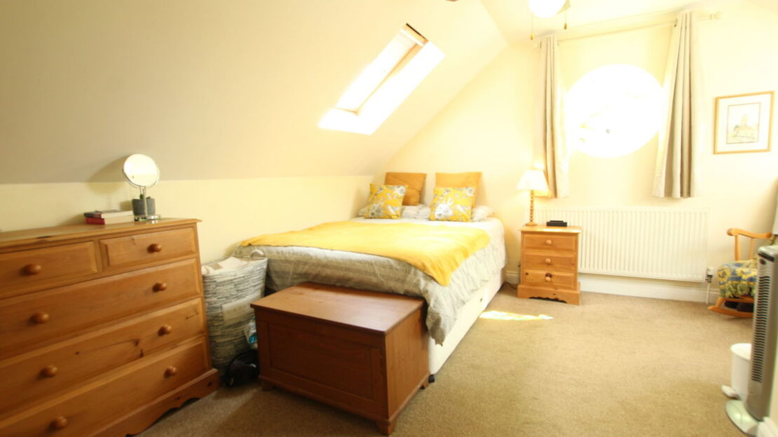 Two Velux style double glazed windows to both side elevations plus a feature round ‘Peacock’ design stained glass window to front elevation, built-in half size doors to eave space storage, built-in walk in wardrobe, door to: