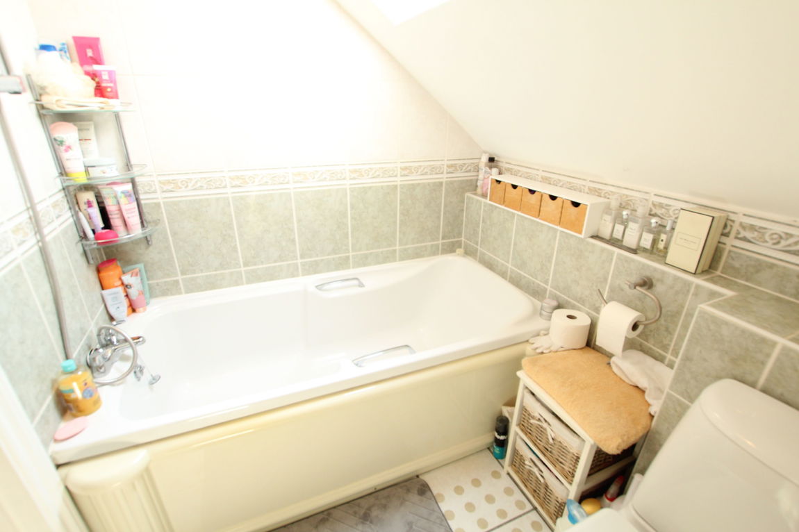 Velux style double glazed window to side elevation, single panel radiator, fully tiled with three piece white suite comprising of low level W.C, wash hand basin, panelled bath with shower/mixer tap over, tiled floor.