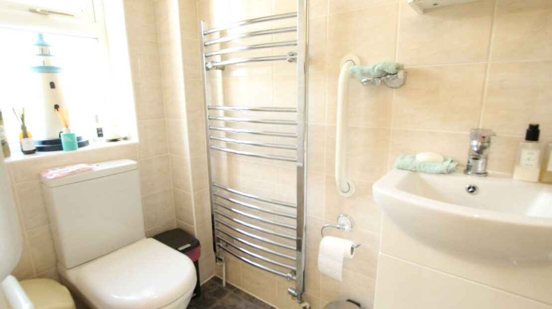 uPVC obscure double glazed window to rear elevation, chrome vertical towel rail/radiator, fully tiled modern three piece white suite comprising of low level W.C, wash hand basin, 1700mm fully tiled shower area, extractor fan.