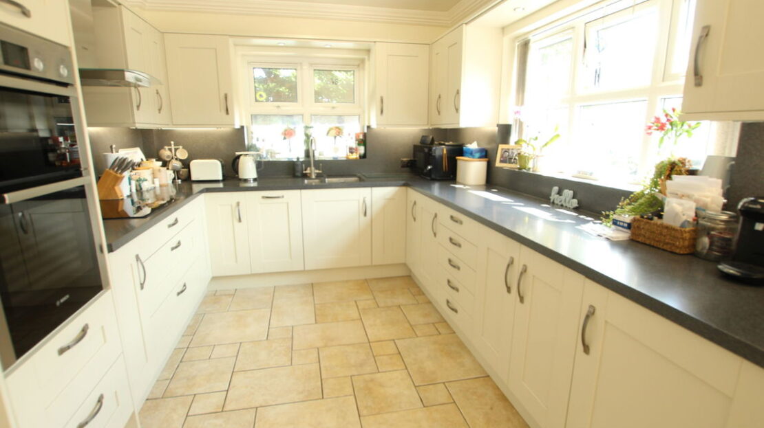 Dual aspect with uPVC double glazed windows to side and front elevations plus twin uPVC double glazed doors to front elevation, single and double panel radiators, extensive modern fitted kitchen comprising of Franke sink unit with mixer tap over, composite ‘Quartz’ effect roll top work surfaces with cut drainer, range of base units incorporating built-in electric hob and electric ovens, built-in dish washer, built-in fridge, matching range of wall mounted units incorporating stainless steel extractor hood, ideal area for table and chairs, tiled floor, door to: