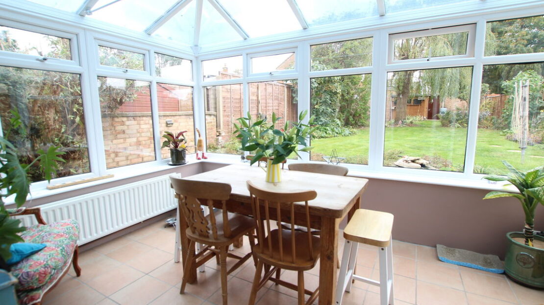 Brick based uPVC double glazed conservatory/garden room with tiled floor, uPVC double glazed double doors to side elevation to garden, double panel radiator.