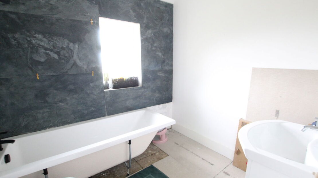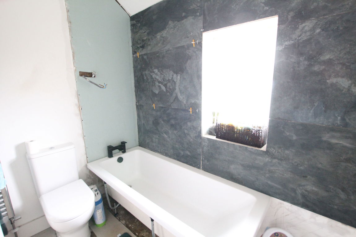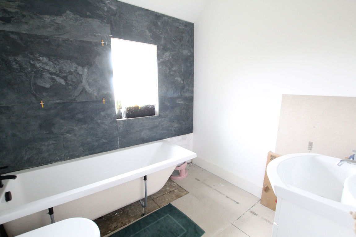 uPVC obscure double glazed window to rear elevation, three piece white suite comprising of low level W.C, wash hand basin, bath.