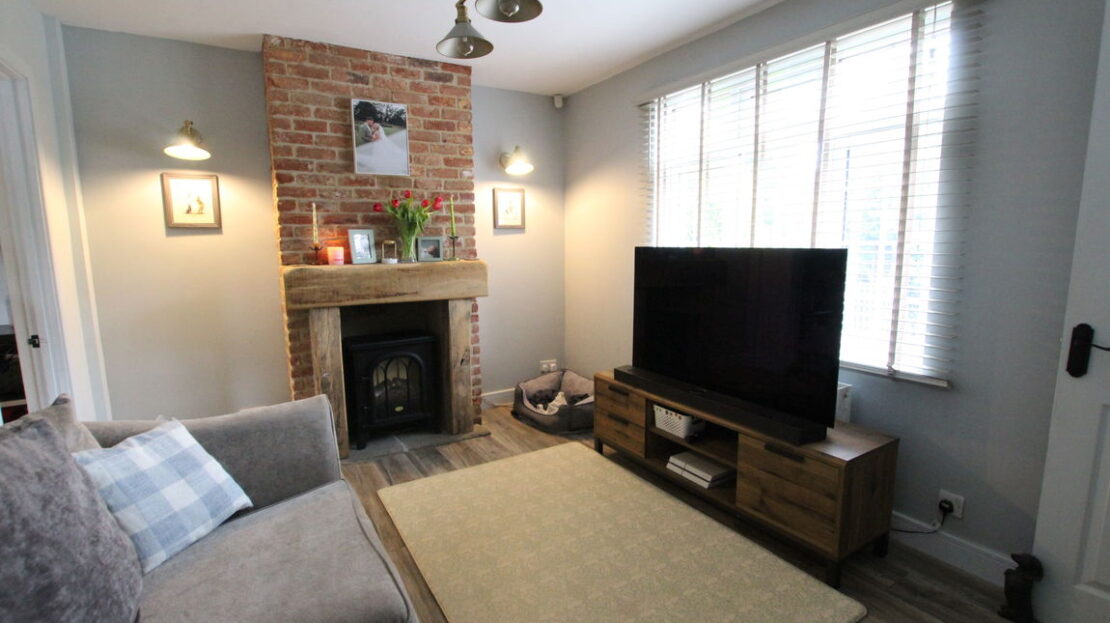 uPVC double glazed window to front elevation, double panel radiator, laminated wood effect flooring, feature exposed brick chimney breast with inset Cast Iron effect electric fire plus a timber surround, door to: