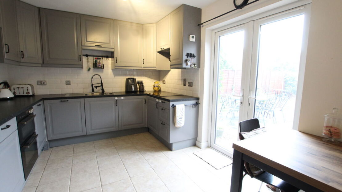 uPVC double glazed twin doors to rear elevation, double panel radiator, extensive modern fitted kitchen comprising of single drainer stainless steel sink unit with antique style mixer tap over, roll top work surfaces, range of base units incorporating built-in electric hob and electric oven, built-in dish washer, space for fridge freezer, tiling to splash areas, ideal area for table and chairs.