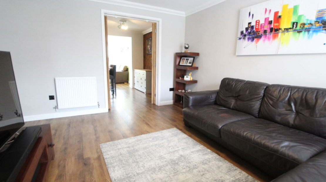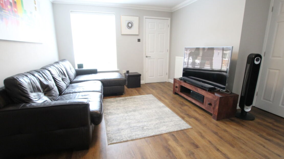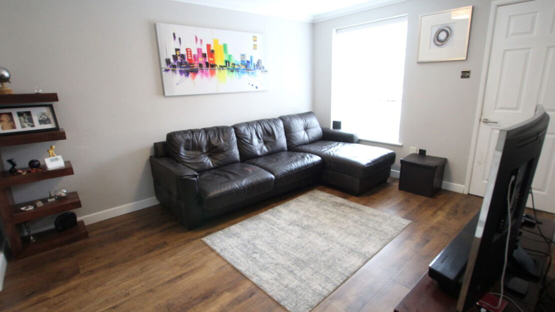 uPVC double glazed window to front elevation, single panel radiator, vinyl wood effect flooring, stairs rising to first floor, coving to ceiling, built-in storage cupboard beneath staircase.