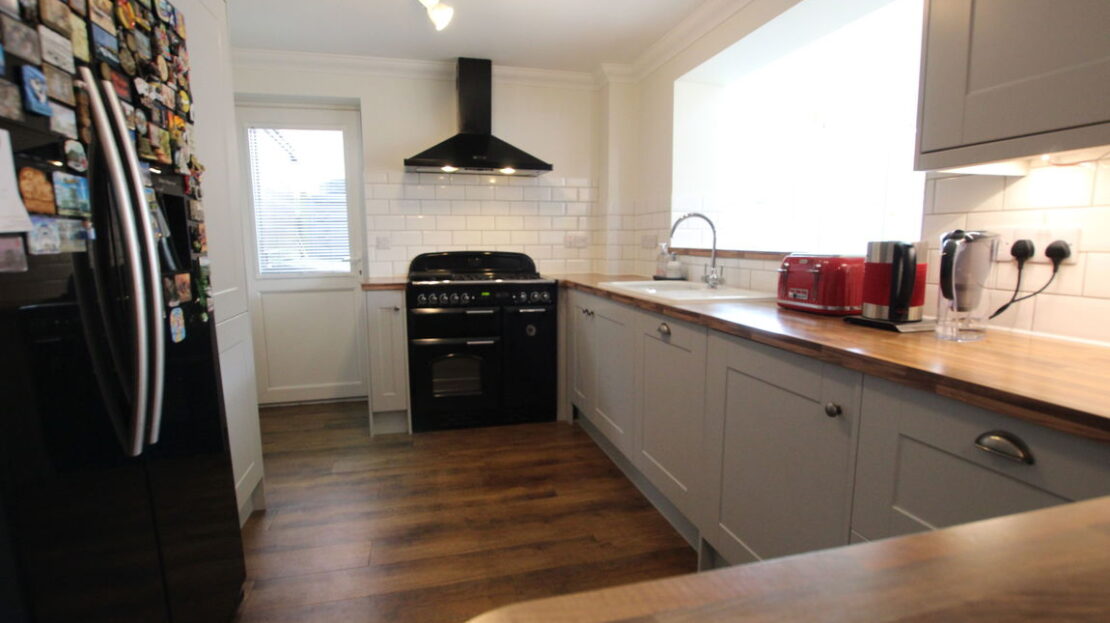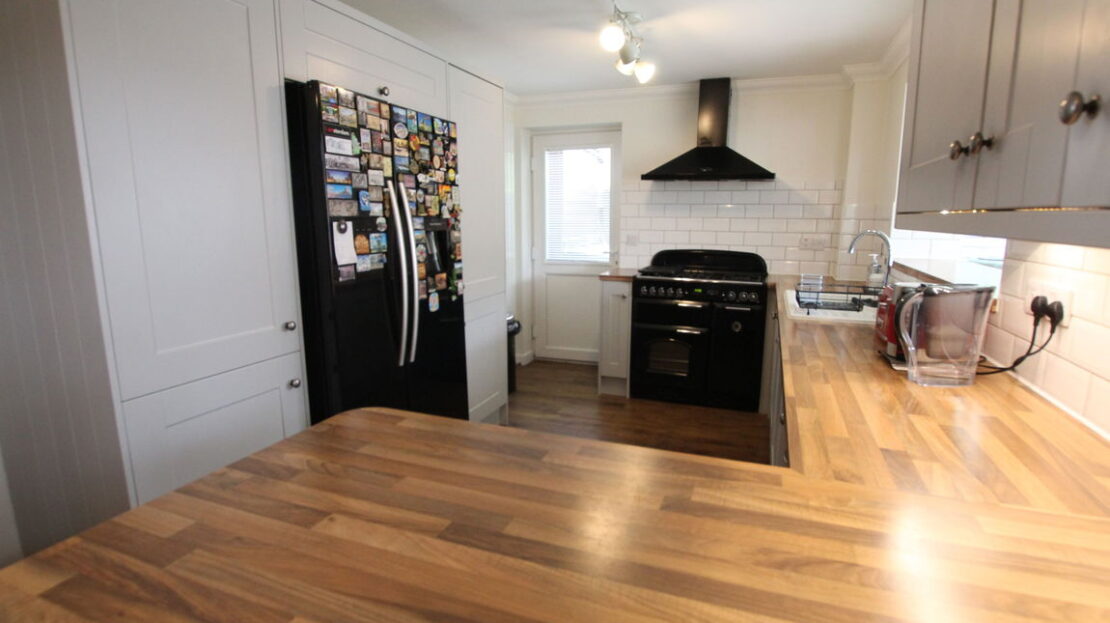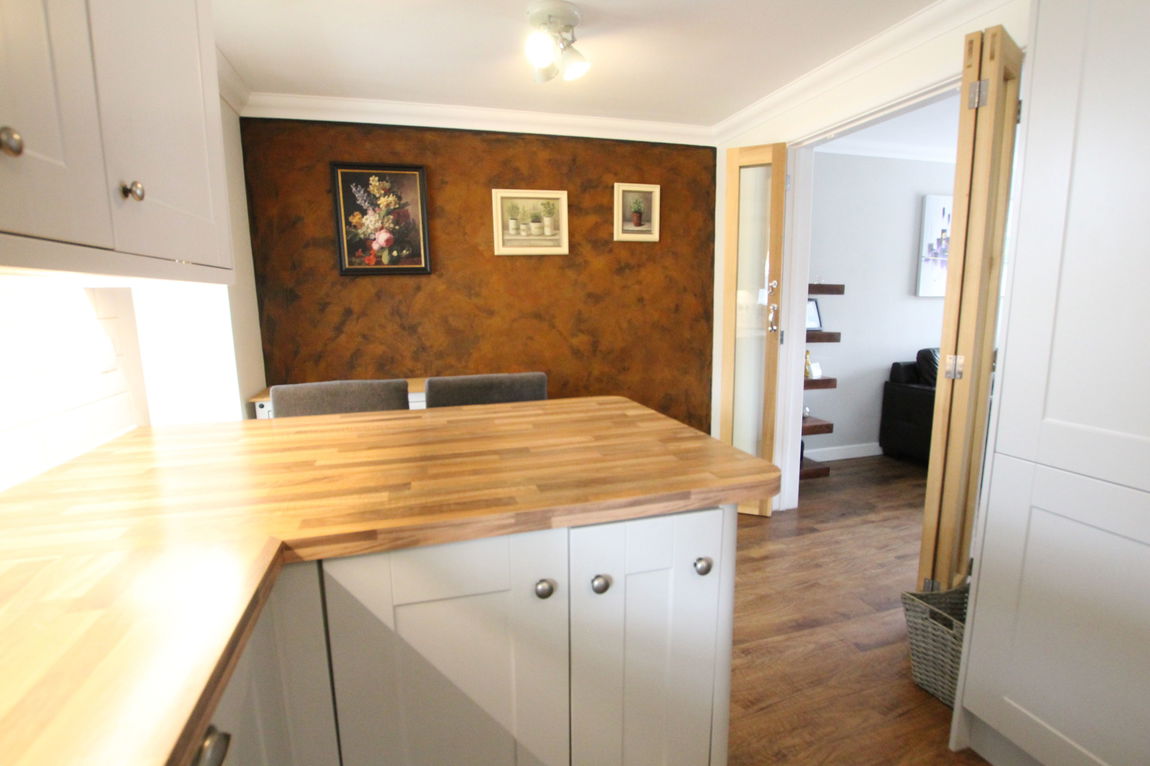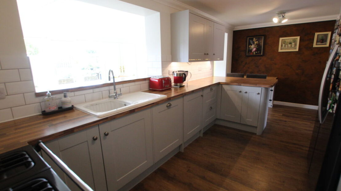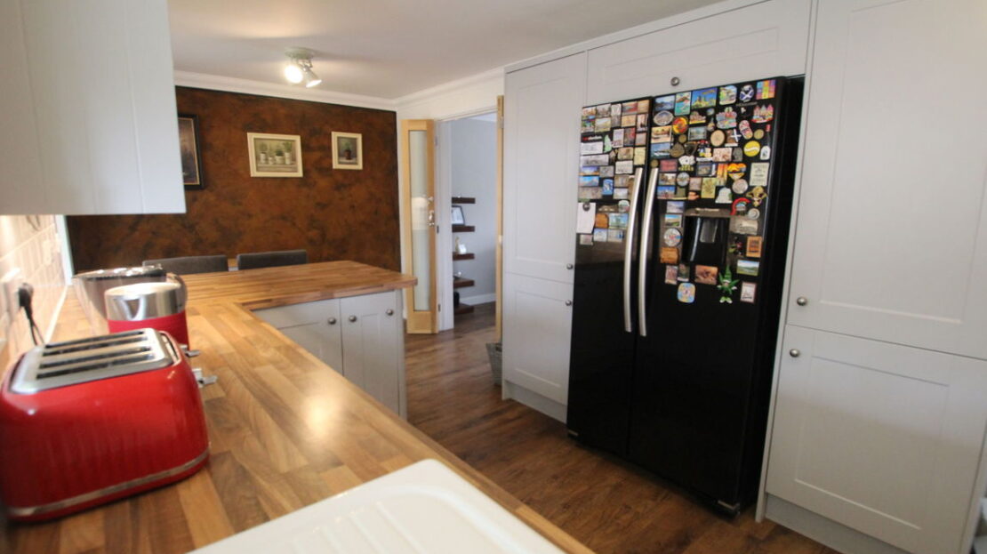 uPVC double glazed door to side elevation, window space into Conservatory area, modern style vertical radiator, extensive modern fitted kitchen comprising of single drainer enamel sink unit with mixer tap over, ‘Butchers Block’ effect roll top work surfaces, range of base units incorporating 800mm Rangemaster five burner with double oven plus grill cooker range, built-in dish washer, built-in washing machine, space for American style fridge freezer, tiling to splash areas, matching range of wall mounted units, 800mm Rangemaster extractor hood, end breakfast bar area, continued vinyl wood effect flooring.