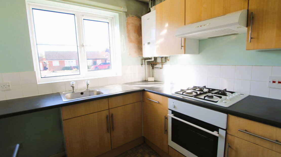 uPVC double glazed window to front elevation, fitted kitchen comprising of single drainer stainless steel sink unit with mixer tap over, roll top work surfaces, range of base units incorporating built-in gas hob and electric oven, plumbing for washing machine, space for fridge, wall mounted units incorporating extractor hood, fitted breakfast bar/worksurface.