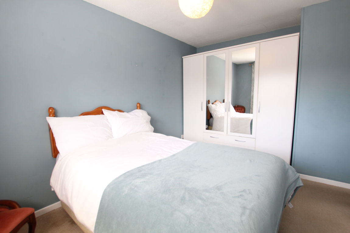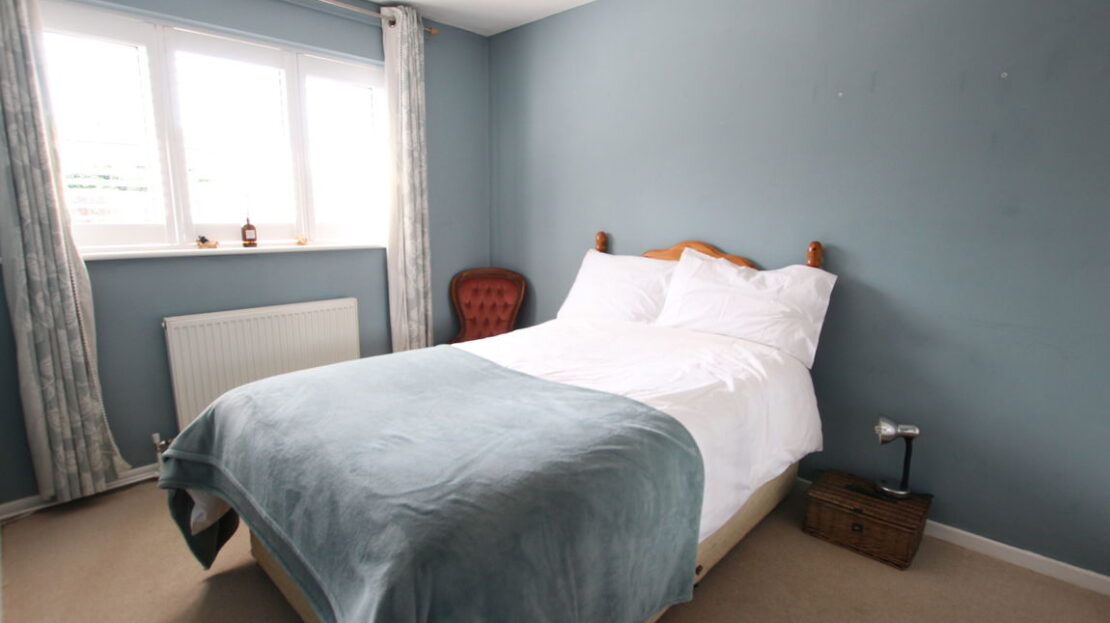 uPVC double glazed window to rear elevation with feature bespoke slatted fitted shutters, single panel radiator, freestanding wardrobe to recess.