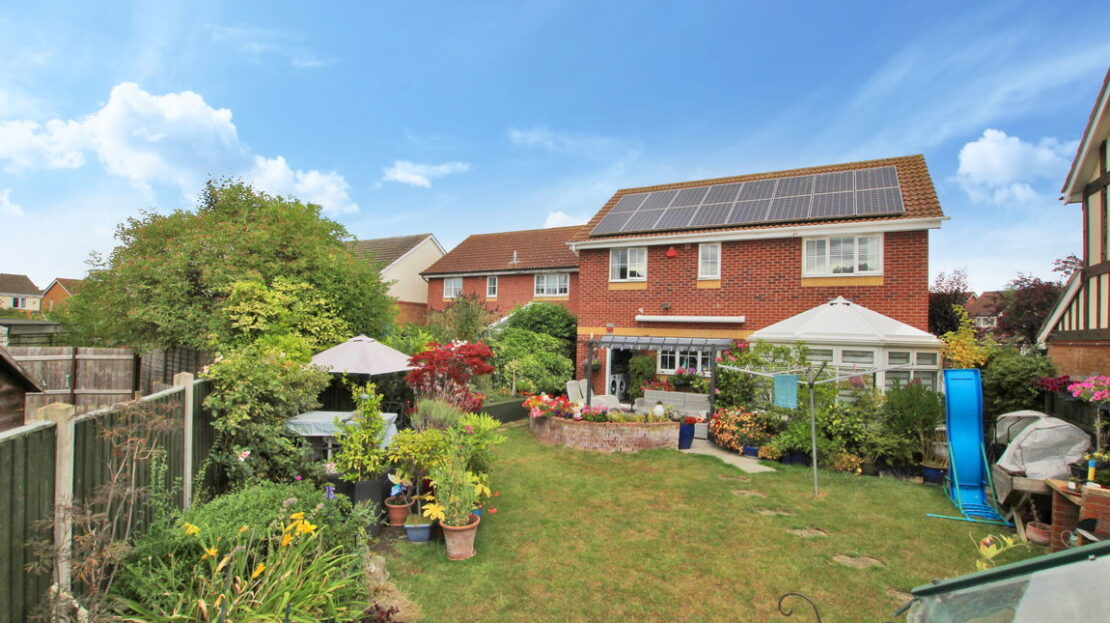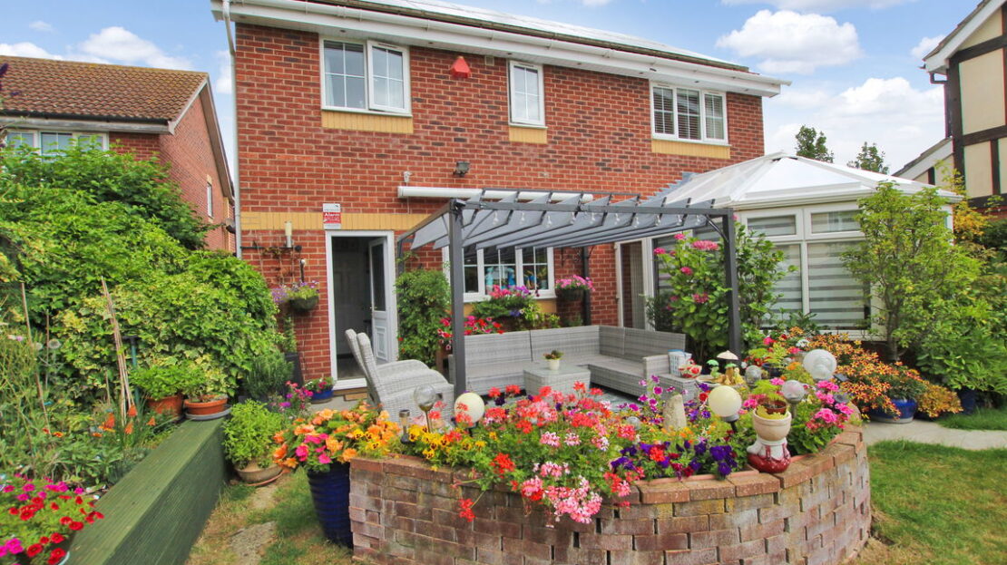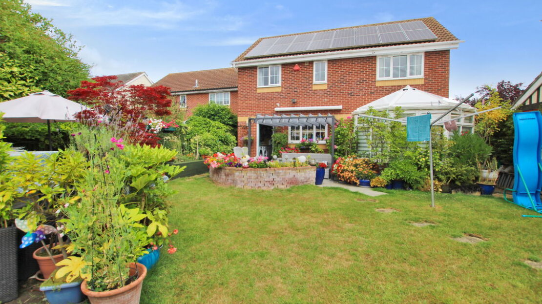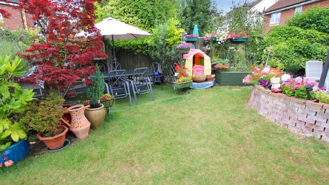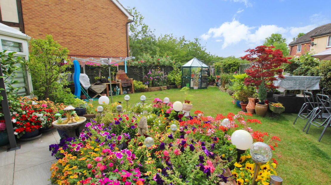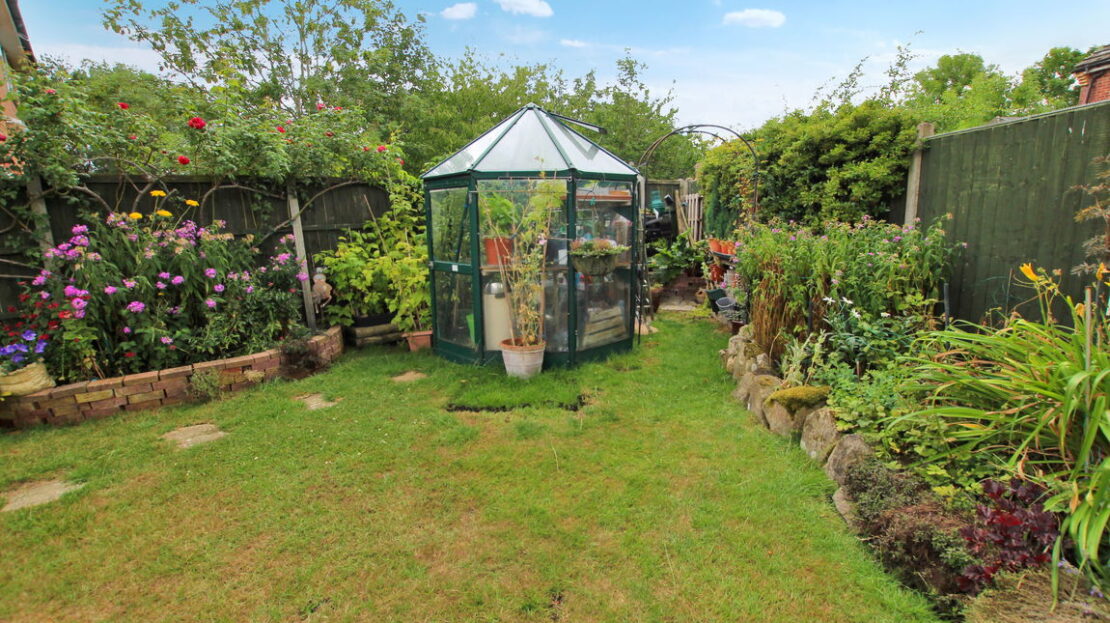 Reaching a point of 65ft including the Conservatory area, a delightful mature garden mainly laid to lawn, various raised beds, hidden side store, feature pergola plus a rear greenhouse.
