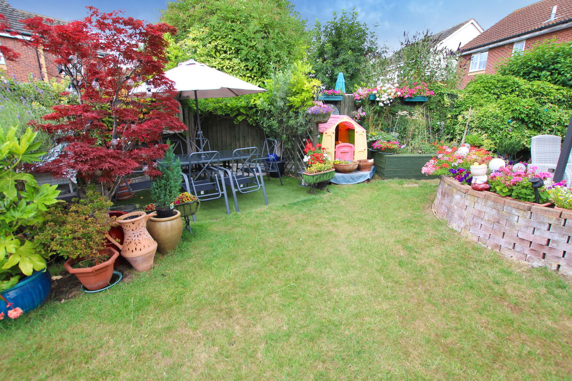 Well-tended and established mainly laid to lawn with beds and borders, side access gate to rear garden.