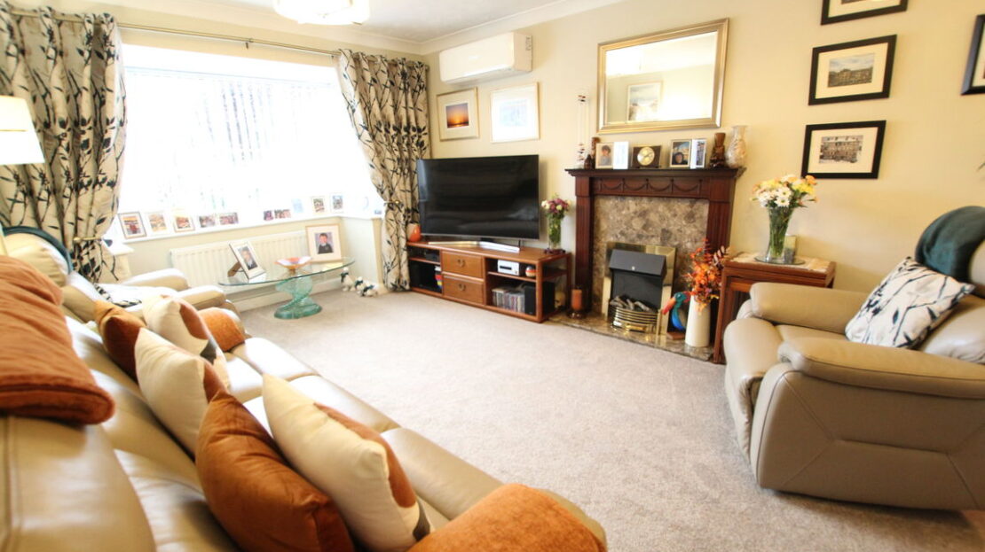 uPVC double glazed bay window to front elevation, three double panel radiators, marble back and hearth fireplace with electric fire, feature wall mounted air conditioning unit, coving to ceiling, glazed twin doors to: