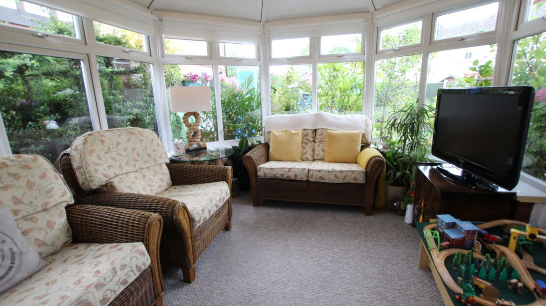 Brick based uPVC double glazed conservatory/garden room, uPVC double glazed door to side elevation to garden, white double vertical radiator, wall mounted air conditioning unit, the roof was professionally insulated and covered by Green Space UK in 2023.