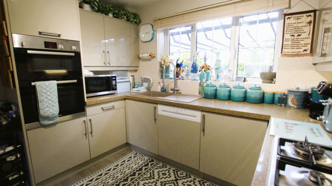 uPVC double glazed window to rear elevation, double panel radiator, modern fitted kitchen comprising of single drainer sink unit with mixer tap over, quartz topped work surfaces, range of base units incorporating built-in stainless steel Bosch gas hob and Bosch electric oven with separate grill, built-in dish washer, built-in fridge, tiling to splash areas, matching range of wall mounted units incorporating extractor hood, door to: