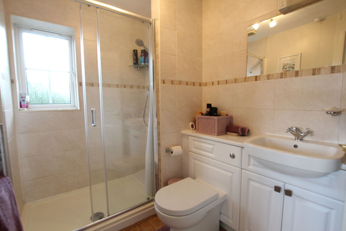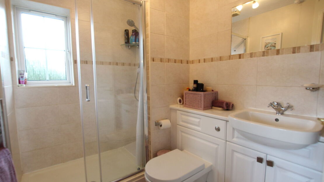 uPVC obscure double glazed window to side elevation, chrome vertical towel rail/radiator, modern three piece white suite comprising of low level W.C and wash hand basin set into a vanity unit, fully tiled shower 1500mm shower area with Triton Shower with sliding door, extractor fan.
