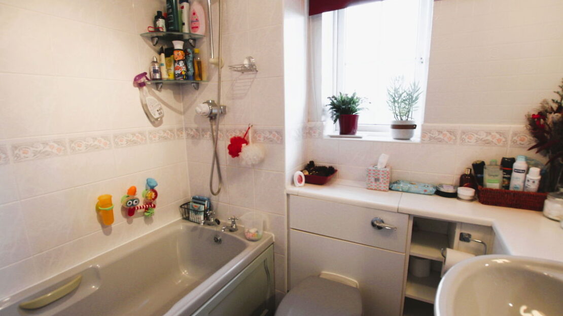 uPVC obscure double glazed window to rear elevation, single panel radiator, three piece suite comprising of low-level W.C, wash hand basin, panel bath with Triton shower over, tiling to splash areas.
