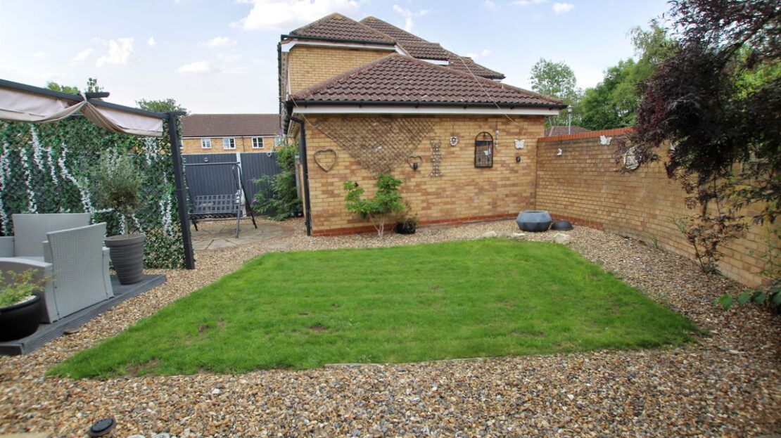 Open plan design corner sited wraparound gardens mainly laid to lawn and shingle with pathway and side access gate to rear garden.