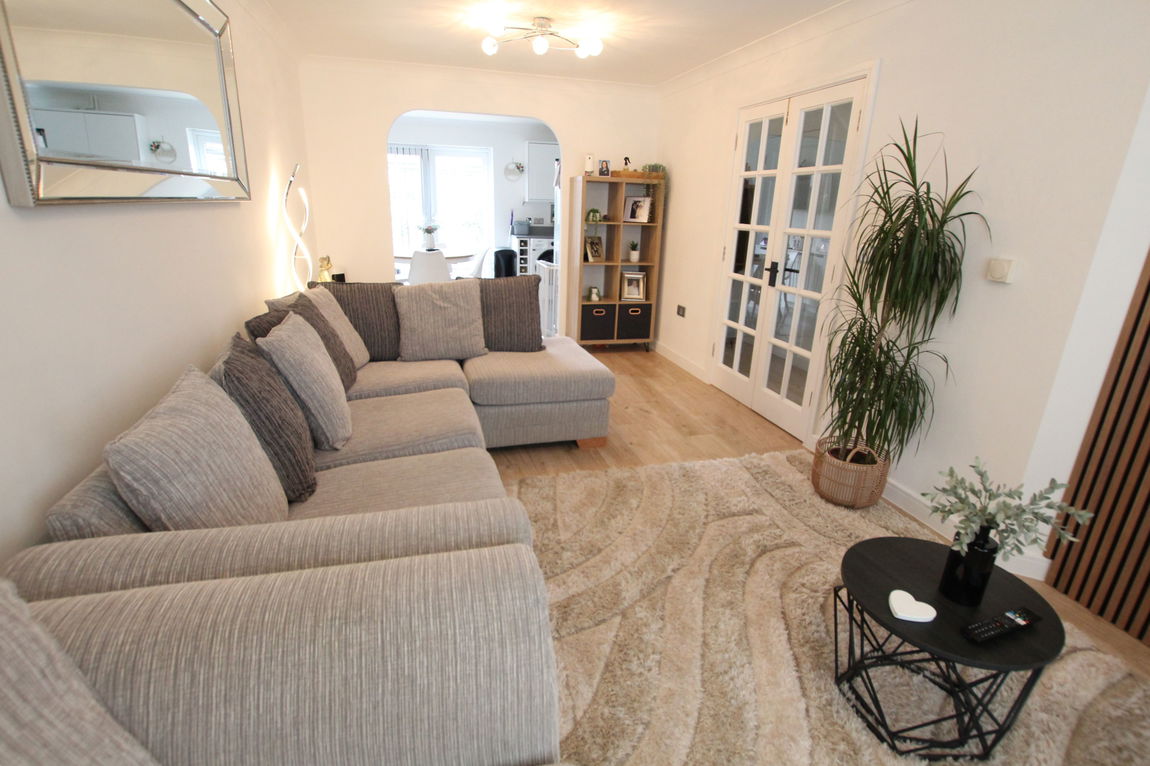 uPVC double glazed bay window to front elevation, double panel radiator, feature media wall with recess for flat screen TV plus a fitted electric illuminated flame effect base fire, laminated wood effect flooring, coving to ceiling.