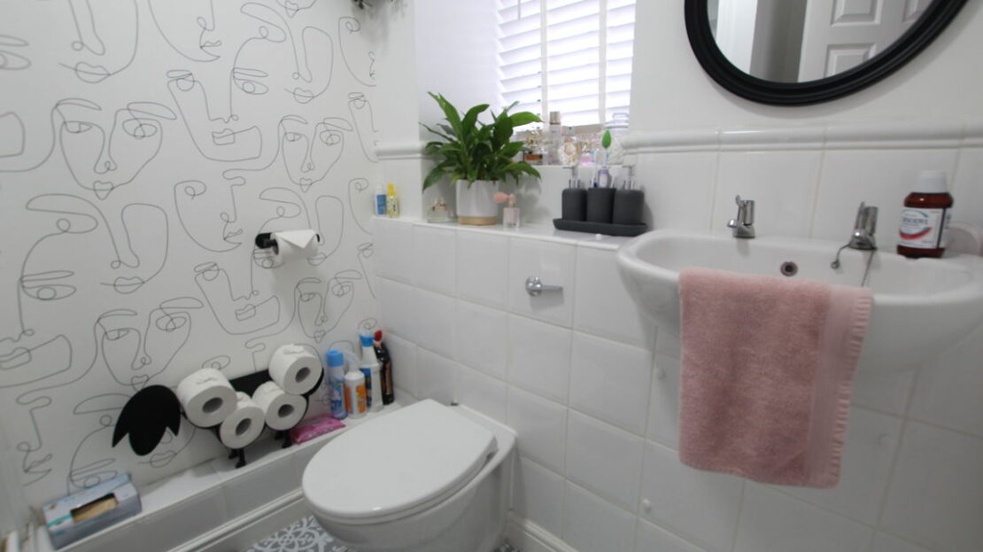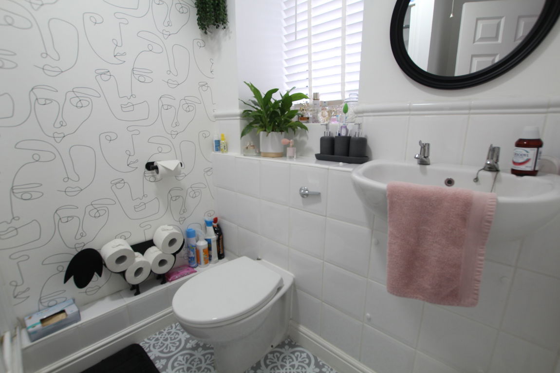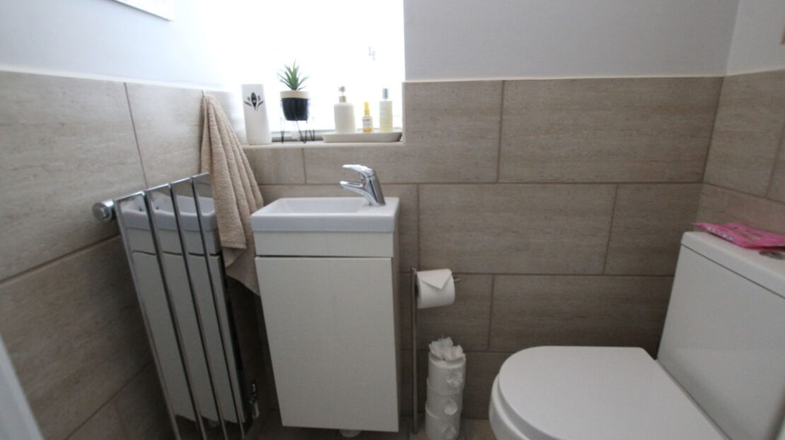 uPVC obscure double glazed window to side elevation, chrome vertical towel rail/radiator, refitted two piece modern white suite comprising of low level W.C, wash hand basin, tiling to dado height and floor.