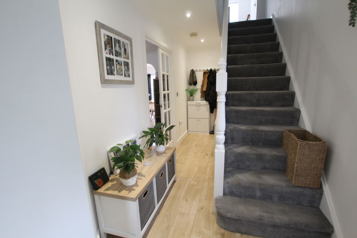 uPVC double glazed window to side elevation single panel radiator, stairs rising to first floor, laminated wood effect flooring, coving to ceiling, fitted meter cupboard, communicating doors to: