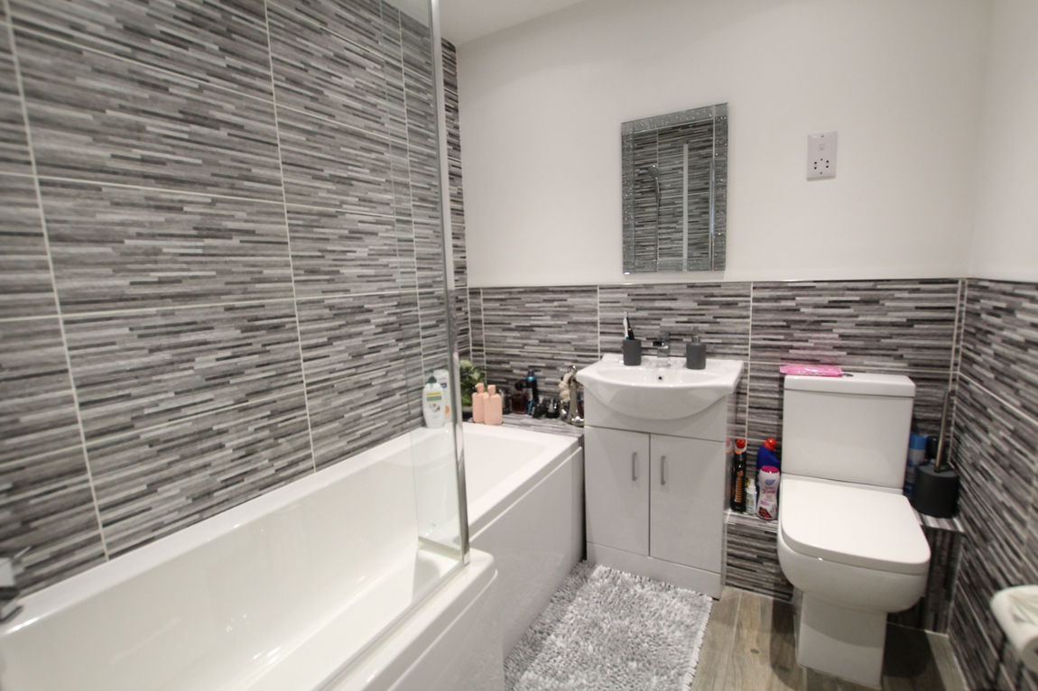 Refitted luxury bathroom with vertical towel rail/radiator, three piece modern suite comprising of low level W.C, wash hand basin, ‘P’ shaped panel bath with shower/mixer tap over and fitted screen, tiling to splash areas.