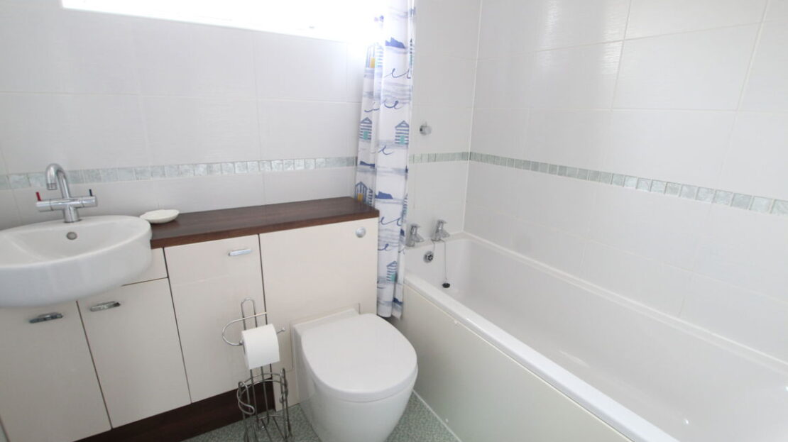 uPVC obscure double glazed window to rear elevation, chrome vertical towel rail/radiator, three piece suite comprising of low level W.C, wash hand basin, panel bath with shower/mixer tap over, tiling to splash areas.