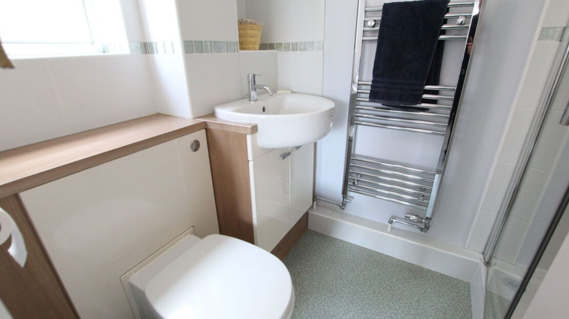 uPVC obscure double glazed window to side elevation, chrome vertical towel rail/radiator, modern three piece white suite comprising of low level W.C, wash hand basin, fully tiled shower cubicle, extractor fan.