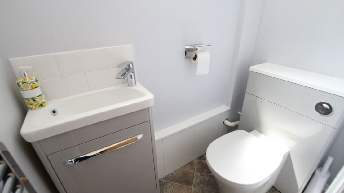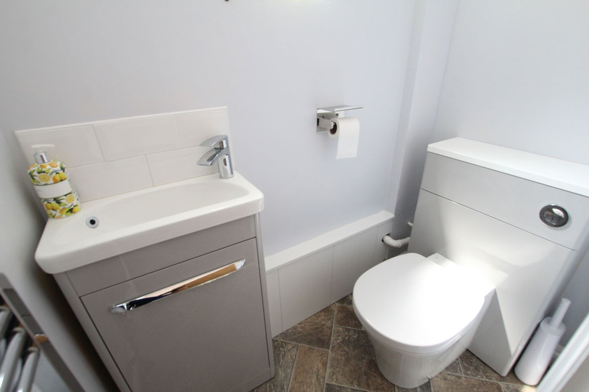 uPVC obscure double glazed window to side elevation, chrome vertical towel rail/radiator, two piece modern white suite comprising of low level W.C, wash hand basin, tiling to splash areas.