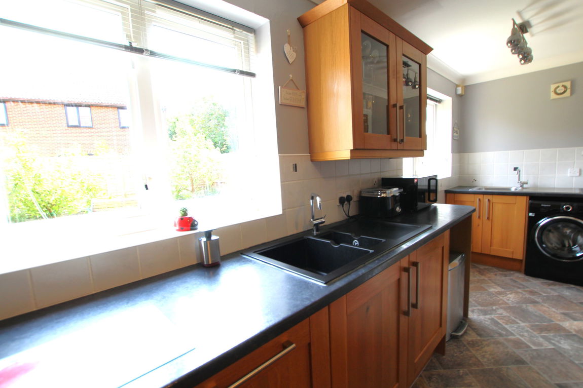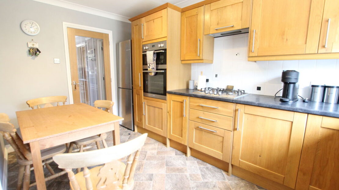 L-shaped kitchen with uPVC double glazed window to rear elevation, two single panel radiators, fitted kitchen comprising of sink unit with mixer tap over, roll top work surfaces, range of base units incorporating built-in stainless steel gas hob and double electric oven, built-in dish washer, space for fridge freezer, utility area has plumbing for washing machine, sink unit with mixer tap, tiling to splash areas, matching range of wall mounted units incorporating stainless steel extractor hood, ideal area for table and chairs, internal door into garage.
