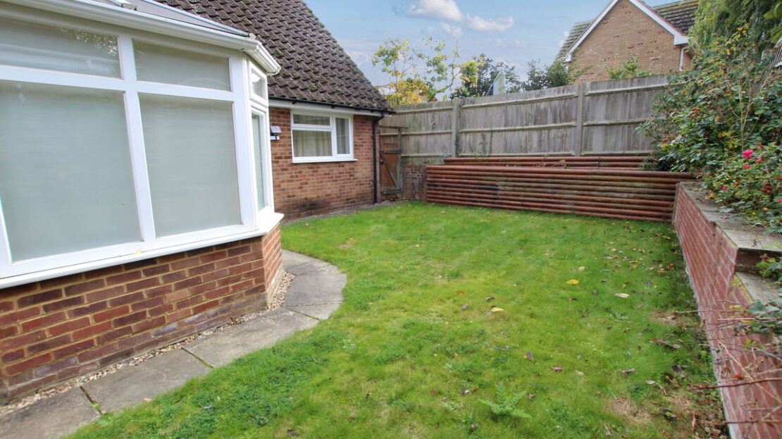 Mainly laid to lawn with paved patio, raised brick borders, enclosed by 6’ panel fencing and trellis work.