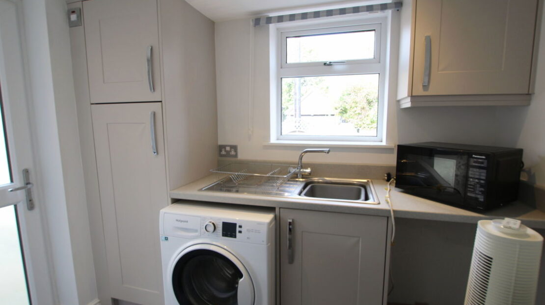 uPVC double glazed window to side elevation, uPVC double glazed door to rear elevation, fitted single drainer stainless steel sink unit with mixer tap over, range of matching base units with plumbing for washing machine and space for tumble dryer, continued ‘high gloss’ tiled flooring.