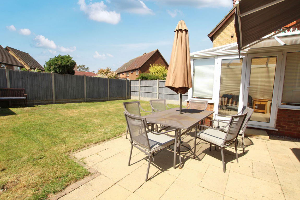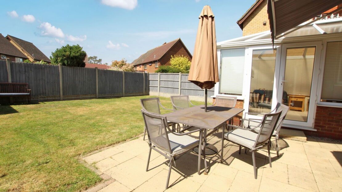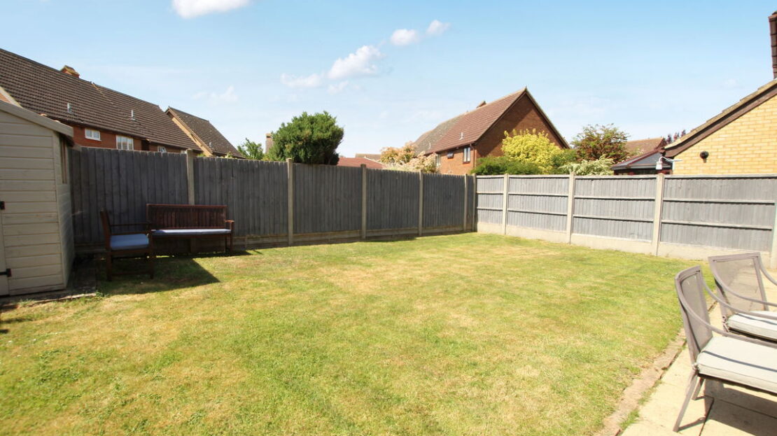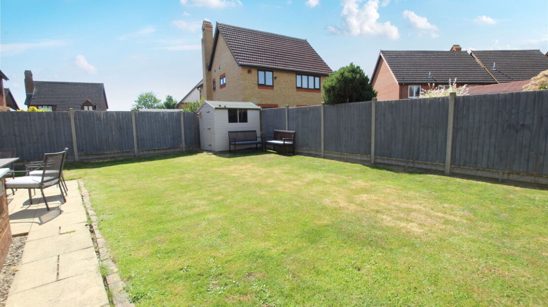 Mainly laid to lawn, paved patio, timber garden store/shed, enclosed by 6′ timber panel fencing.