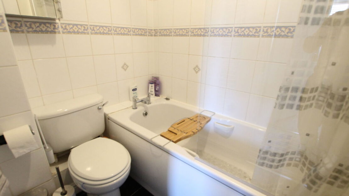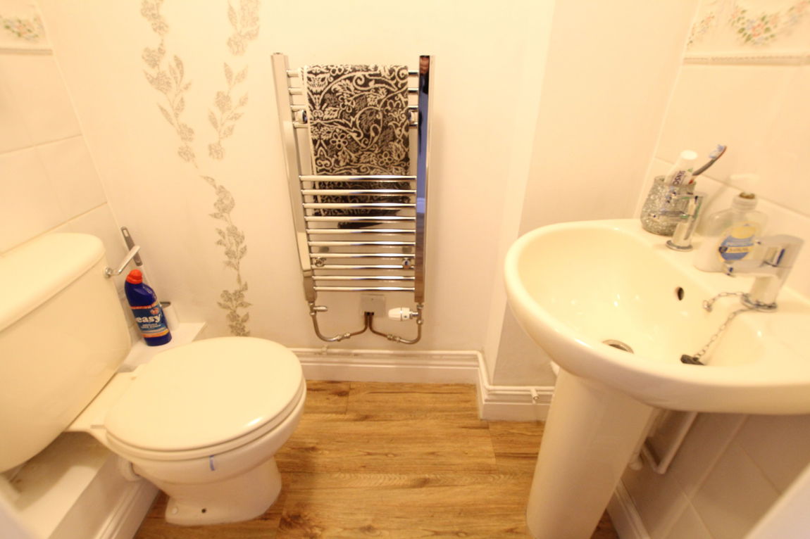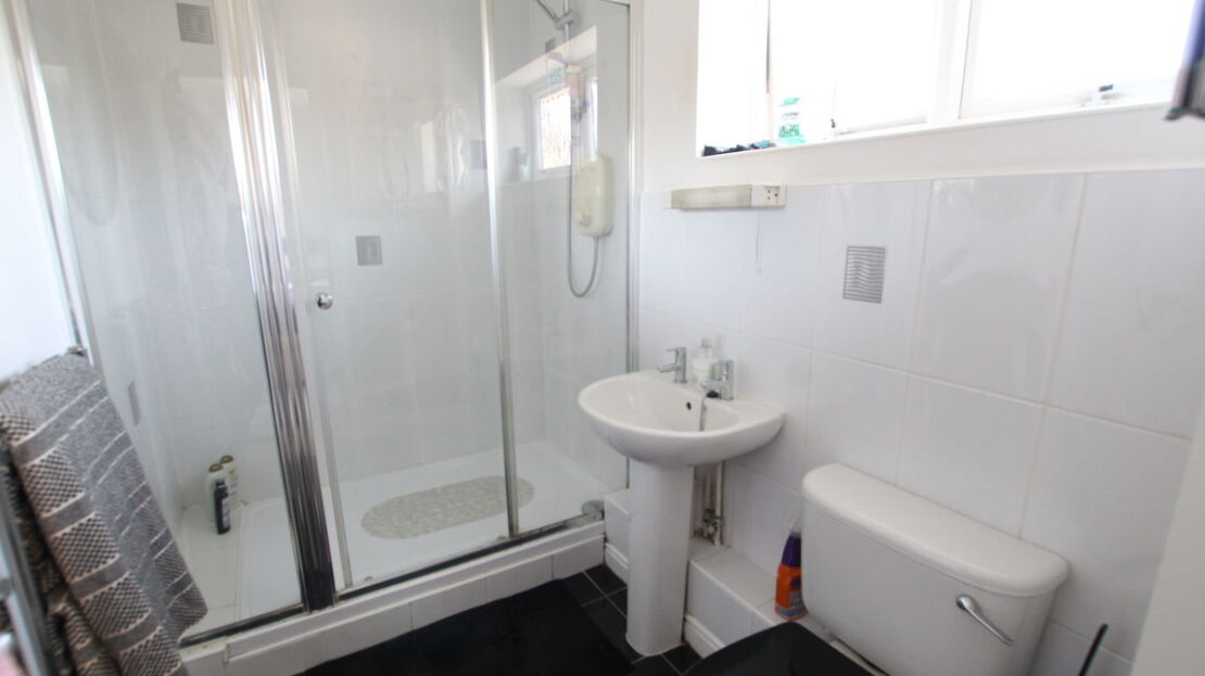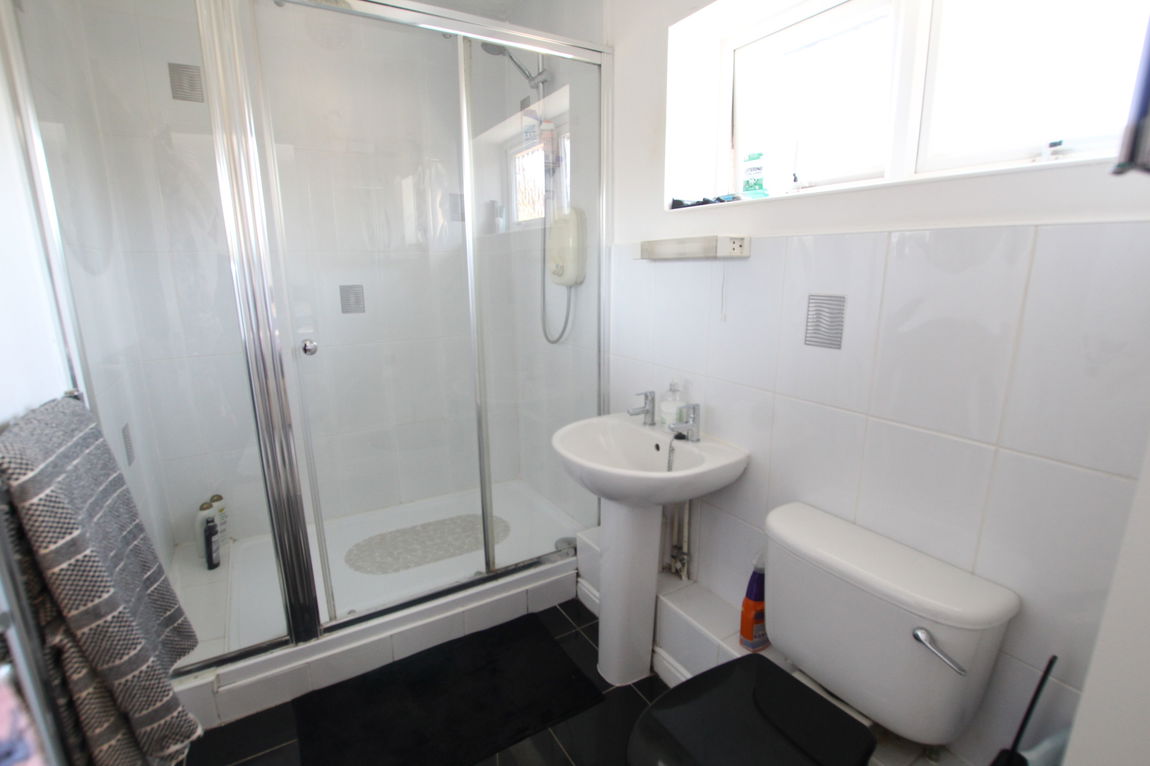 uPVC obscure double glazed window to rear elevation, chrome vertical towel rail/radiator, modern three piece white suite comprising of low level W.C, wash hand basin, fully tiled shower cubicle, extractor fan.