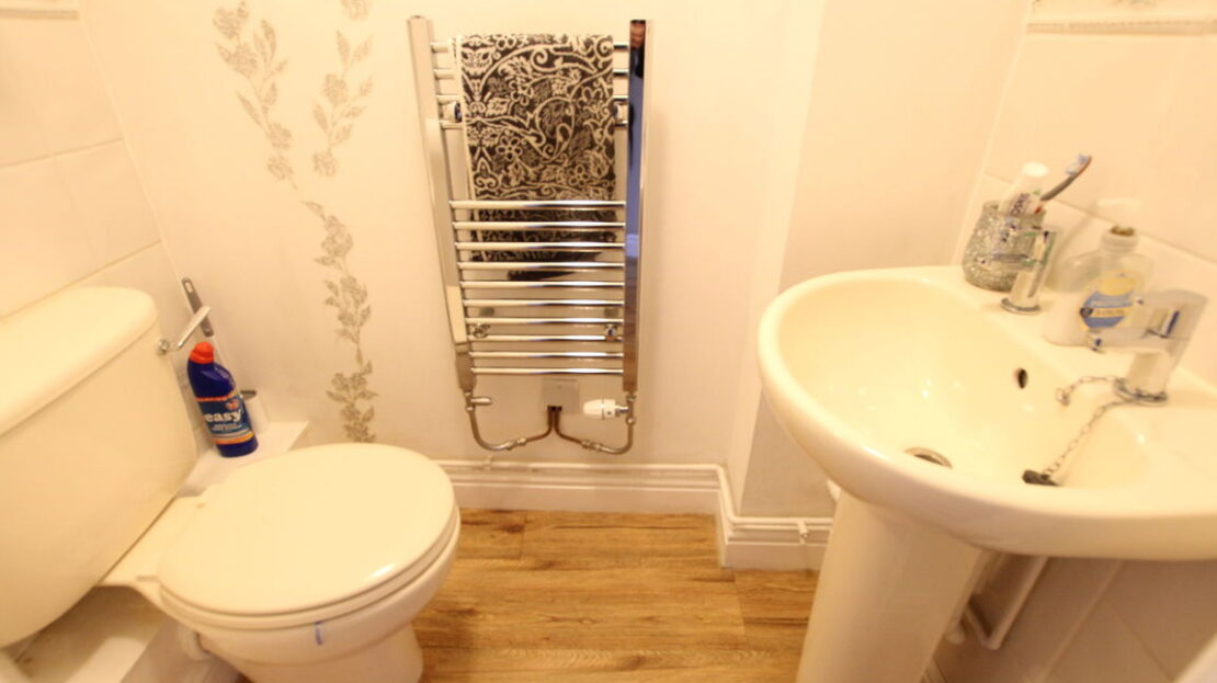 Chrome vertical towel rail/radiator, two piece modern white suite comprising of low level W.C, wash hand basin, tiling to splash areas.