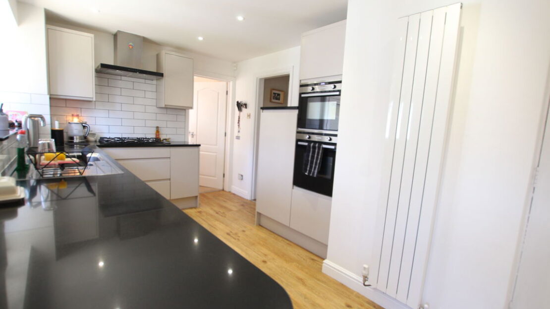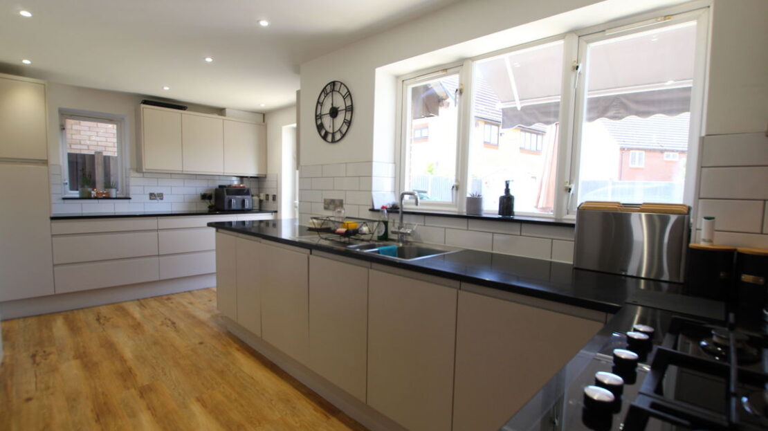 L-shaped room with uPVC double glazed window to rear elevation and uPVC double glazed door to rear elevation, vertical radiator, luxury fitted kitchen comprising of stainless steel sink unit with mixer tap and additional hot tap, quartz ’30mm’ work surfaces, range of base units incorporating built-in stainless steel ‘five burner’ gas hob, electric oven and additional electric ‘combi’ oven, built-in dish washer, built-in fridge, tiling to splash areas, matching range of wall mounted units incorporating stainless steel extractor hood, built in breakfast bar, wall mounted boiler.