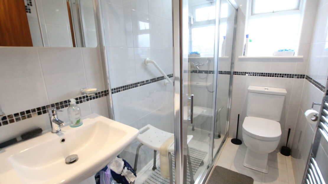uPVC obscure double glazed window to rear elevation, chrome vertical towel rail/radiator, three piece suite comprising of low level W.C, wash hand basin, fully tiled shower cubicle