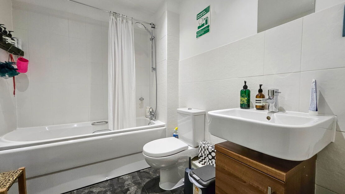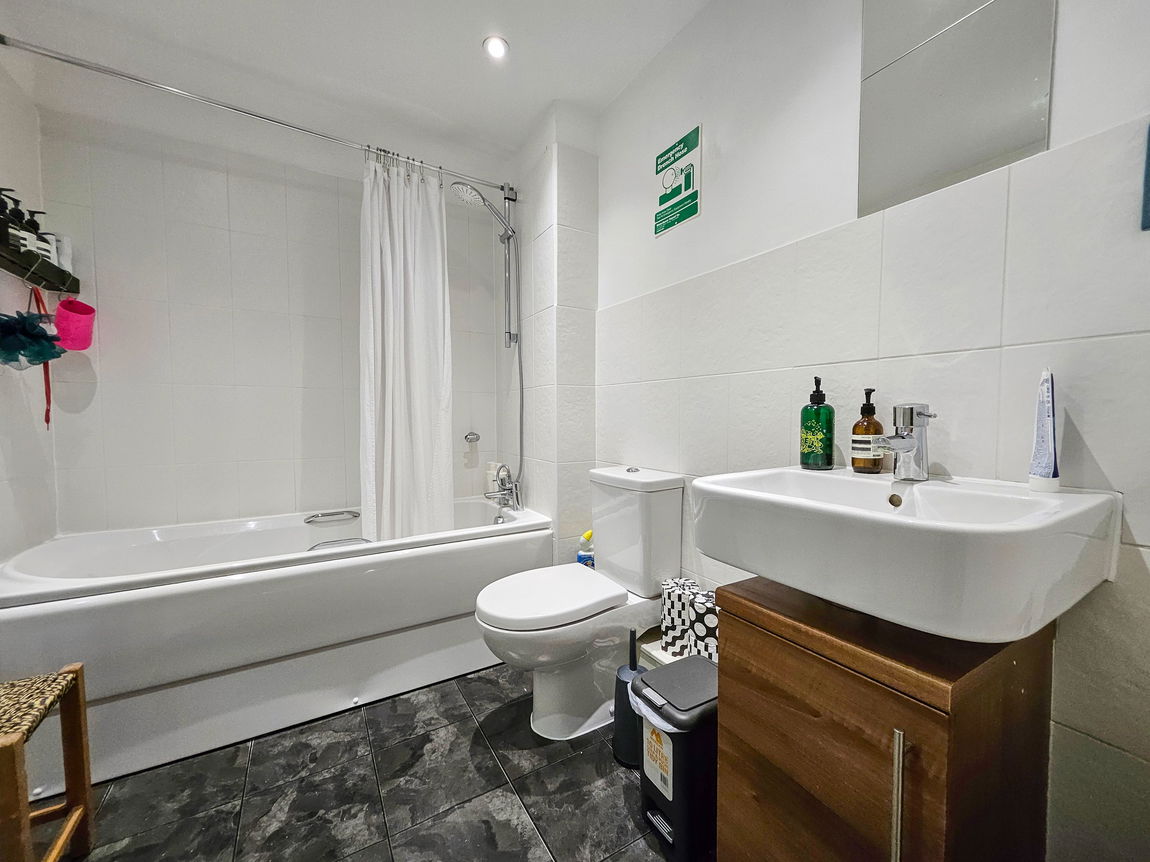 Vertical towel rail/radiator, three piece suite comprising of low level W.C, wash hand basin, panel bath with shower/mixer tap over, tiling to splash areas.