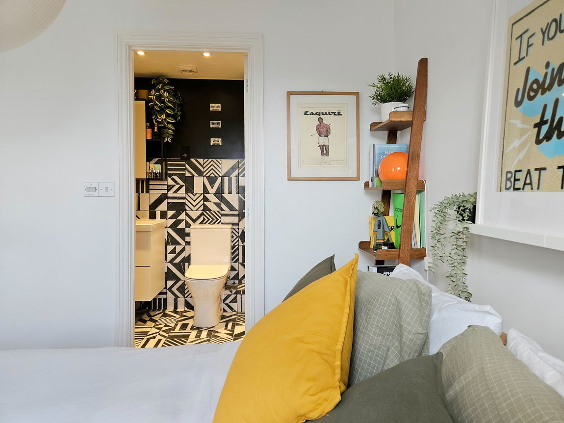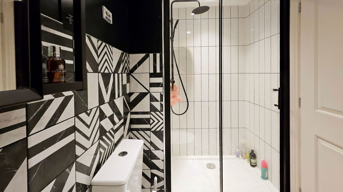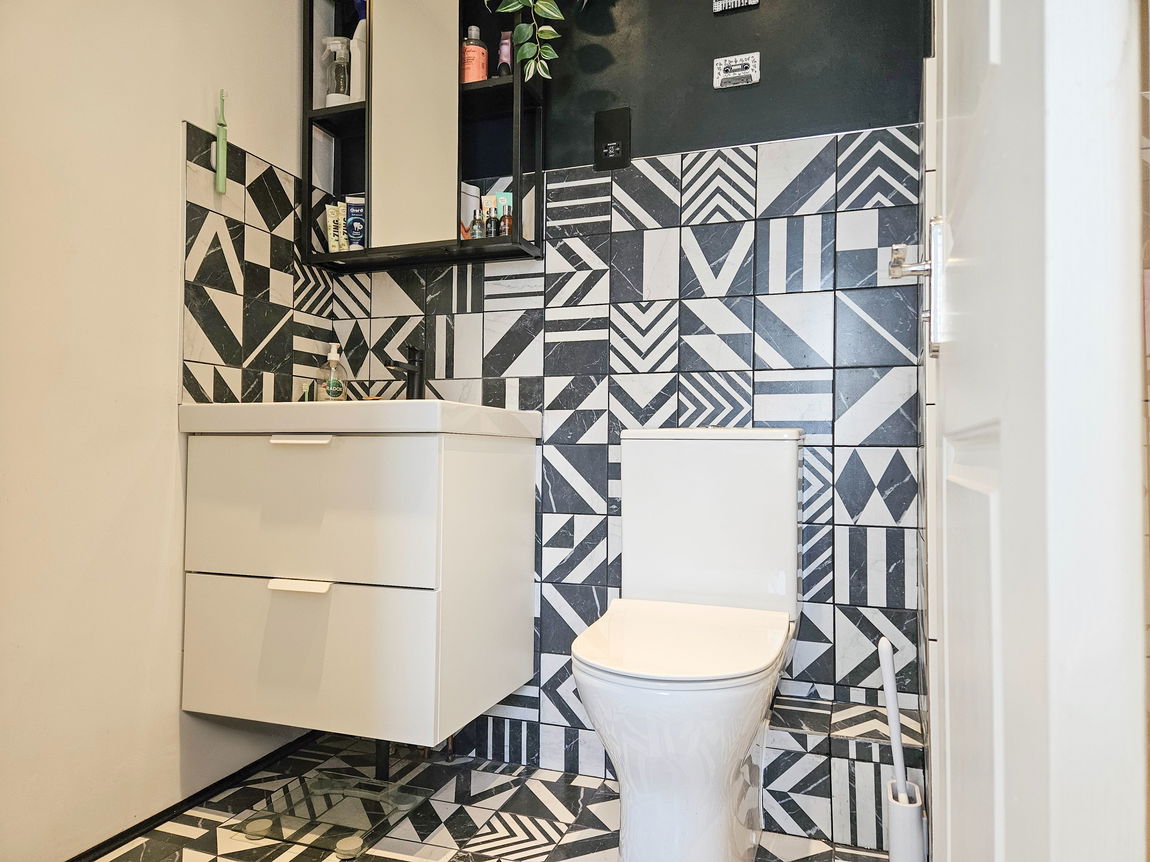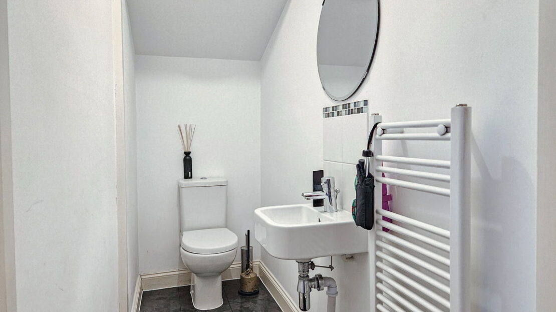 Vertical towel rail/radiator, two piece modern white suite comprising of low level W.C, wash hand basin, tiling to splash areas.