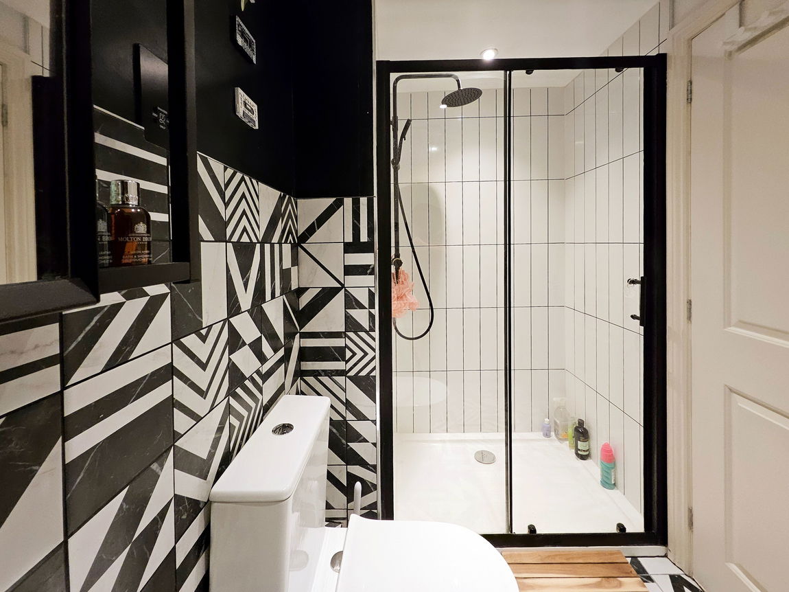Vertical towel rail/radiator, three piece white suite comprising of low level W.C, wash hand basin, fully tiled 1000mm shower cubicle, extractor fan.