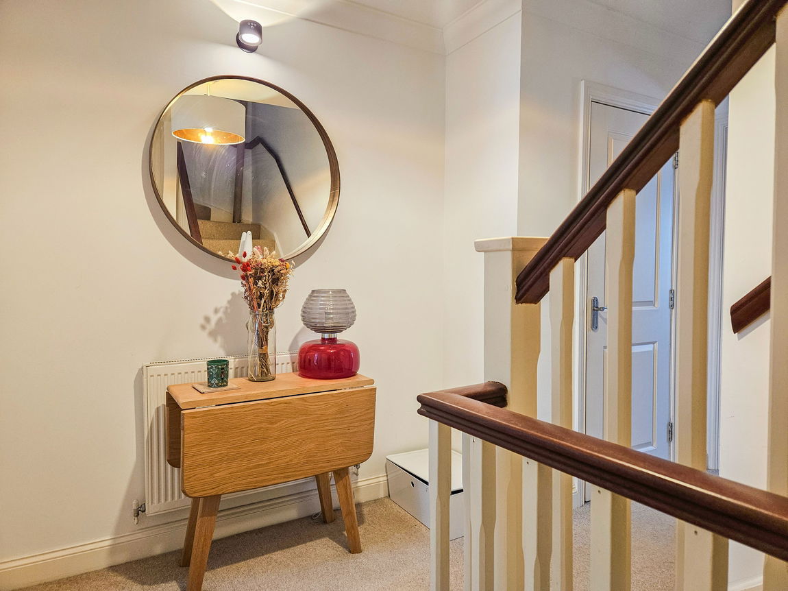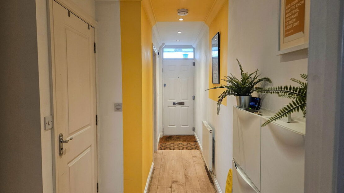 Single panel radiator, built-in storage cupboard, stairs rising to second floor, communicating doors to: