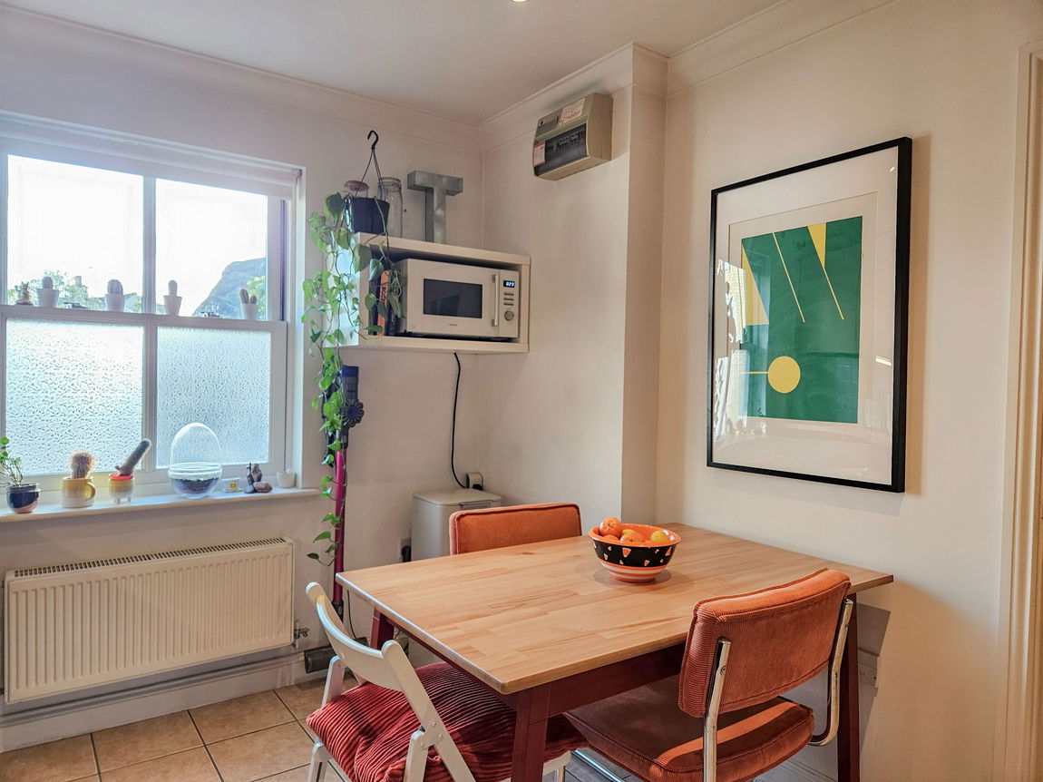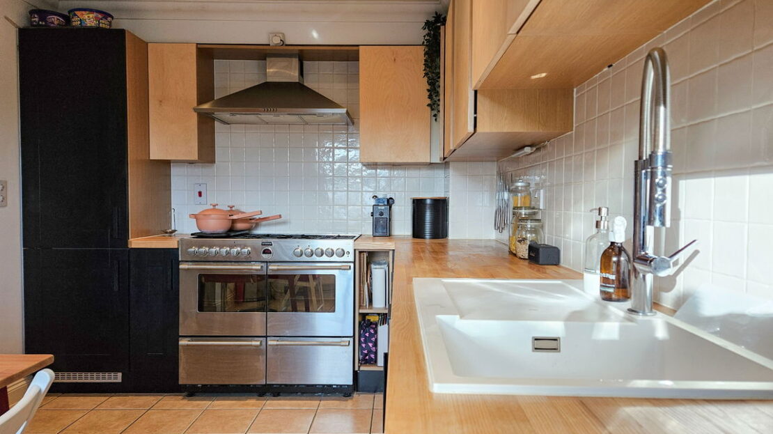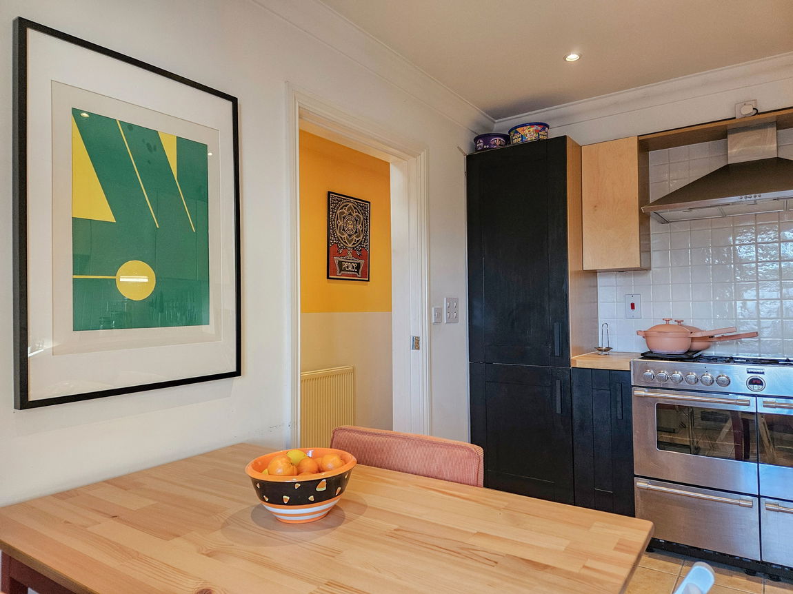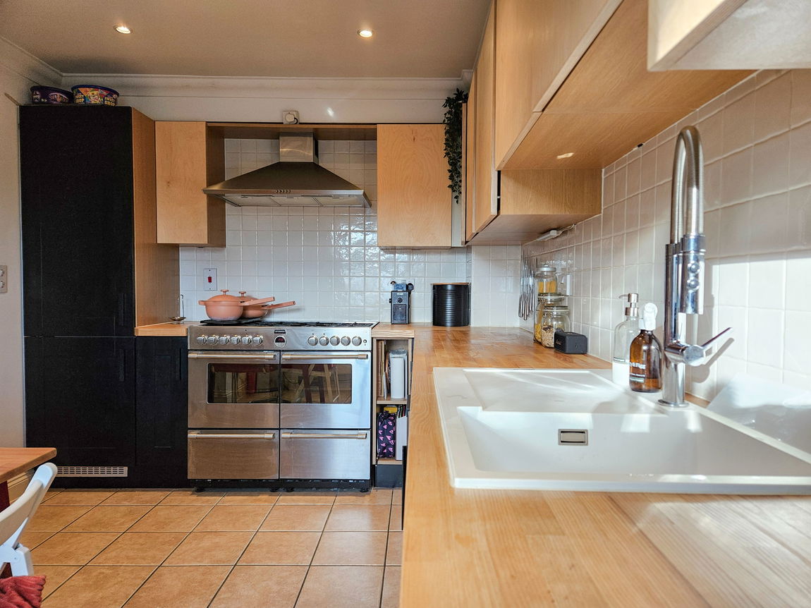 Sash style wood double glazed window to front elevation, double panel radiator, extensive modern fitted kitchen comprising of single drainer stainless steel sink unit with mixer tap over, roll top work surfaces, range of base units incorporating 1000mm stainless steel ‘Stoves’ Cooker Range with seven gas hobs and twin electric ovens, built-in dish washer, built-in washing machine, built-in fridge freezer, tiling to splash areas, matching range of wall mounted units incorporating wall mounted gas boiler plus a 900mm stainless steel extractor hood, ideal area for table and chairs.