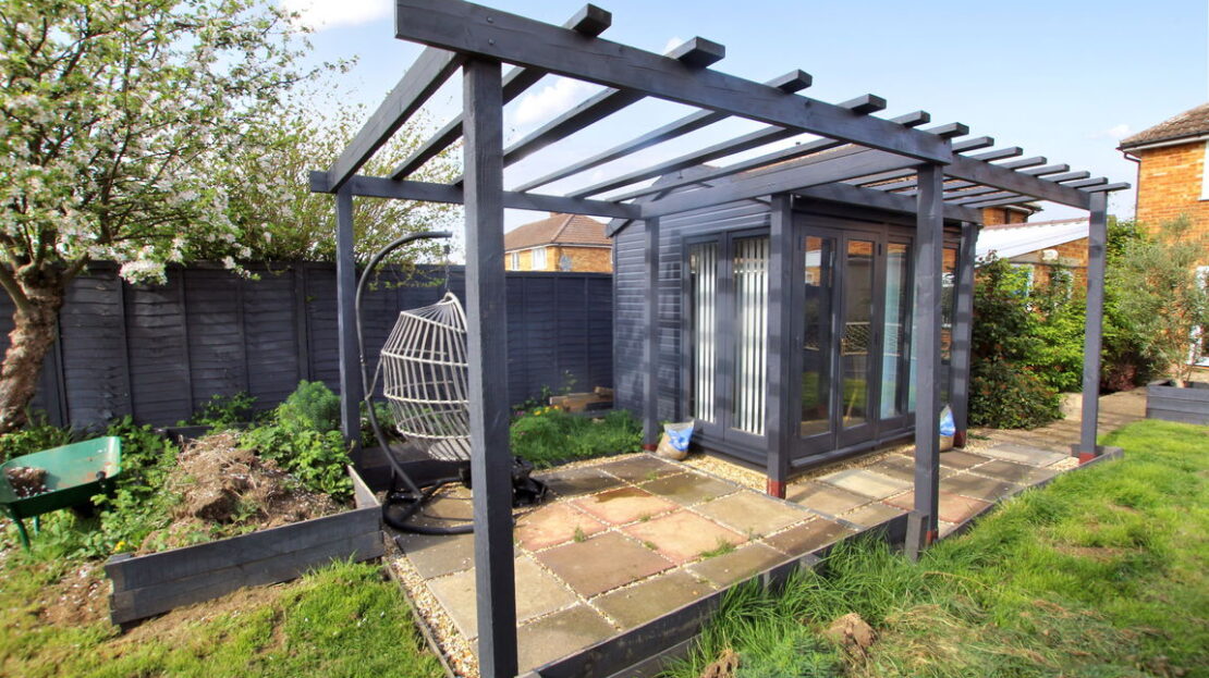 A detached versatile 9’7 X 7’6 timber office pod with sealed unit double glazing and power connected.