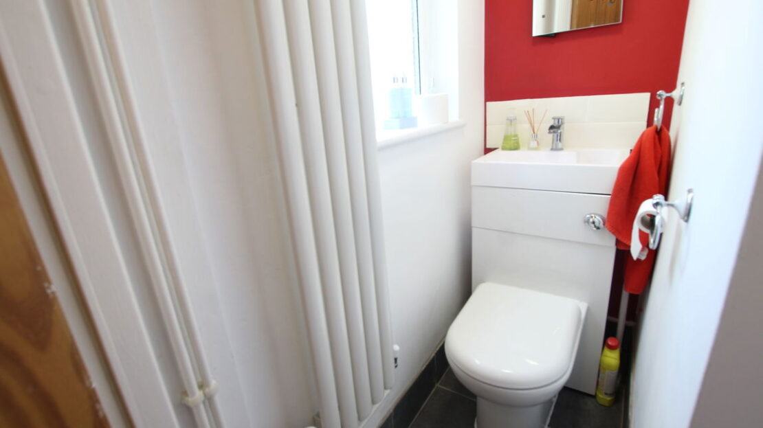 uPVC obscure double glazed window to side elevation, vertical modern style radiator, modern white low level W.C with wash hand basin over, tiling to splash areas, tiled floor.